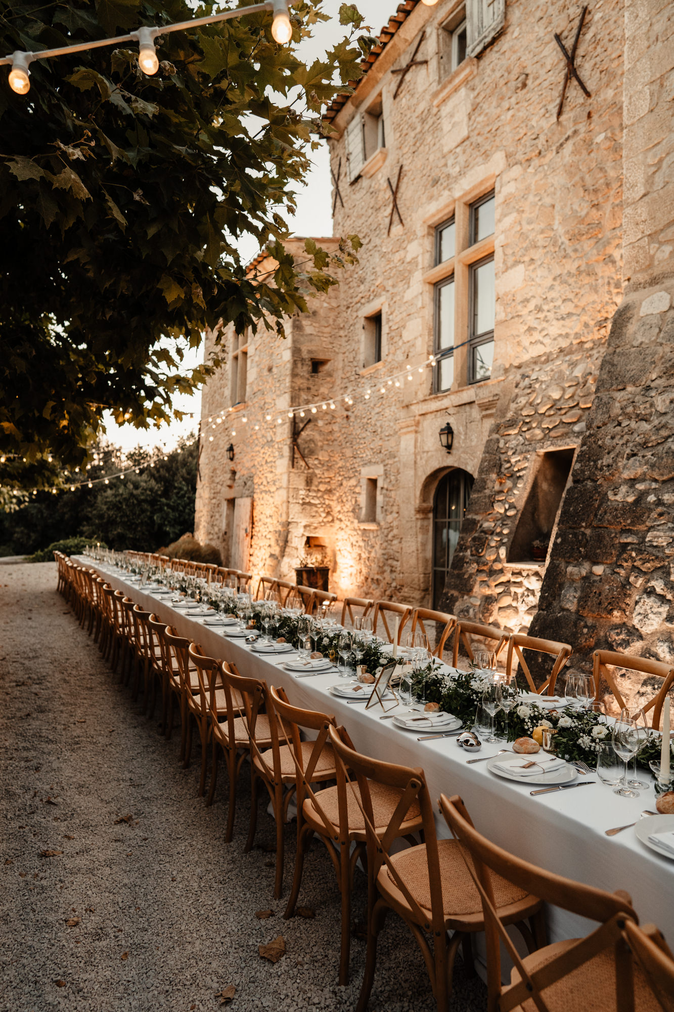 Une magnifique disposition façon banquet avec une décoration choisie à merveille, le tout dans un cadre féerique avec des guirlandes guinguettes